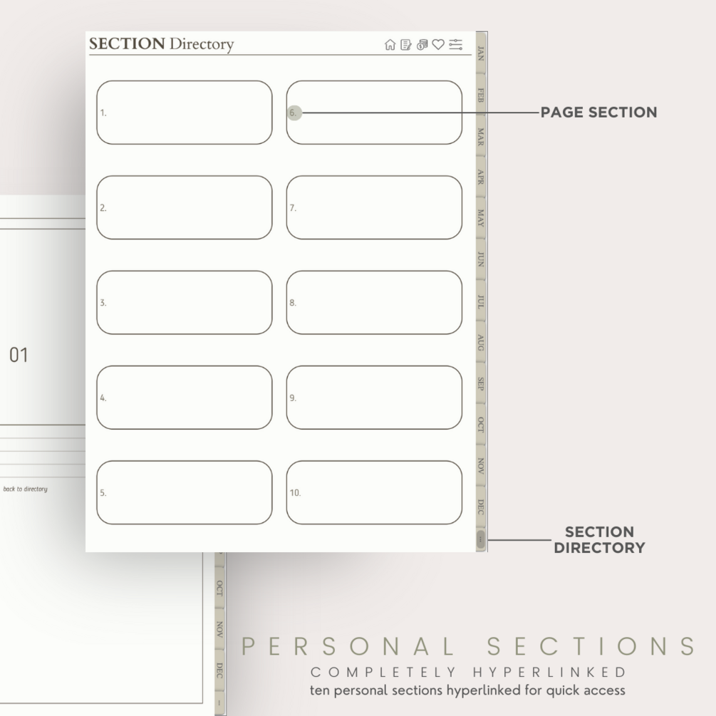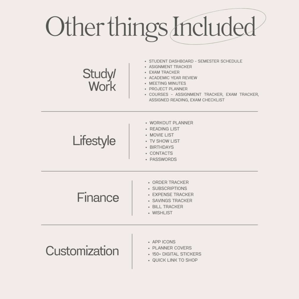 Delve into the versatility of our 10 personal notebook sections, offering not just variety but adaptability. With six distinct page layouts, tailor each section to suit your unique needs. The Study/Work section is a haven for productivity, featuring a comprehensive student dashboard, semester schedule, assignment tracker, exam tracker, academic year review, meeting minutes, and project planner. Stay on top of your educational game with dedicated course sections – assignments, exams, assigned readings, and exam checklists.
