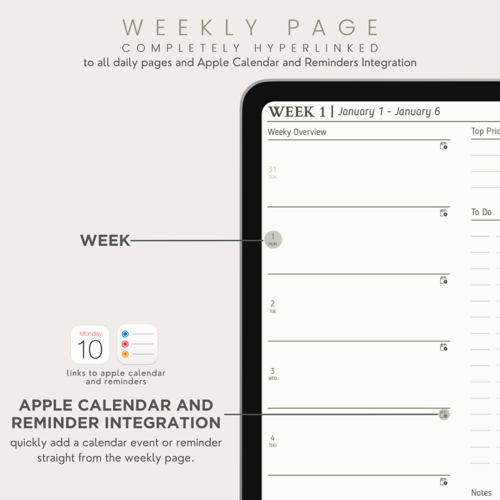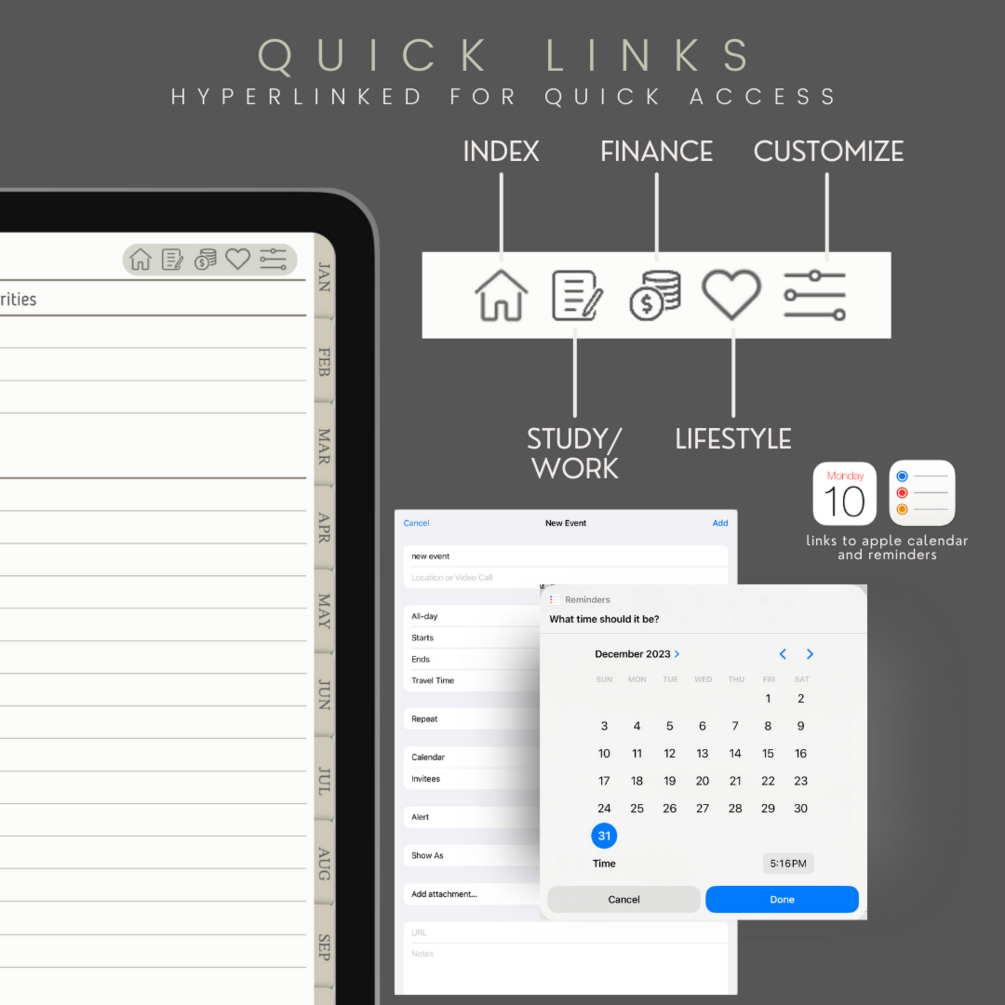 Designed for seamless navigation, the planner features hyperlinked dates, weeks, and calendars, providing swift access to crucial moments and deadlines. Dive into each month, where a canvas of possibilities unfolds. Engage with dedicated vision boards, set and track your goals, and reflect on your journey with purposeful review pages. Your aspirations find a home within the pages of "The Alcove Planner."