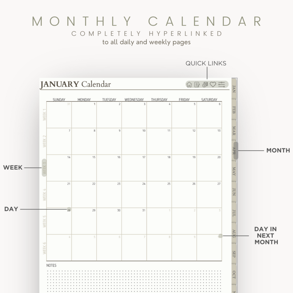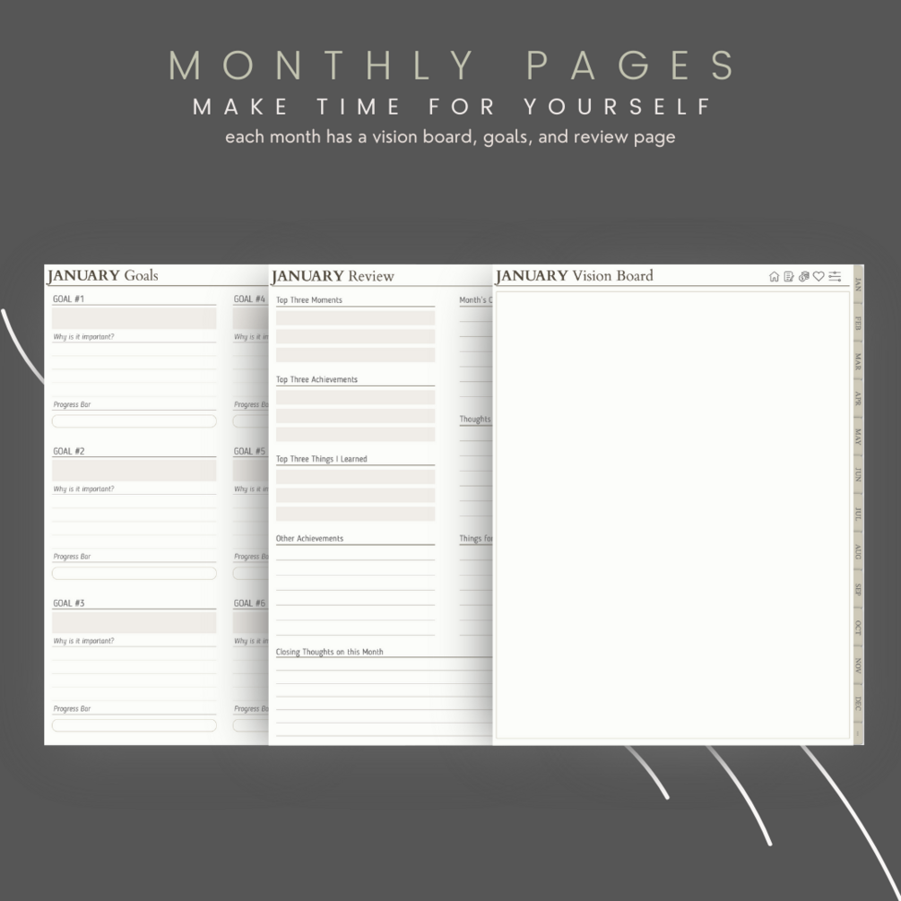Designed for seamless navigation, the planner features hyperlinked dates, weeks, and calendars, providing swift access to crucial moments and deadlines. Dive into each month, where a canvas of possibilities unfolds. Engage with dedicated vision boards, set and track your goals, and reflect on your journey with purposeful review pages. Your aspirations find a home within the pages of "The Alcove Planner."